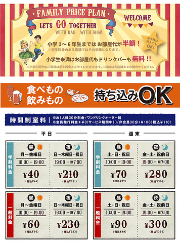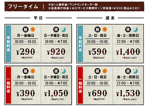 ★フリータイム料金★お一人様料金/ワンドリンクオーダー制/会員発行料金0円(サービス期間中!)/非会員税込+\330※料金表は全て会員料金です。