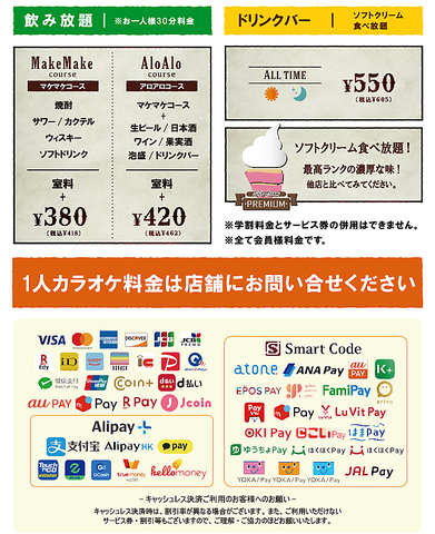 ★飲み放題・ドリンクバー料金★お一人様30分料金/会員発行料金0円(サービス期間中!)※料金表は全て会員料金です。