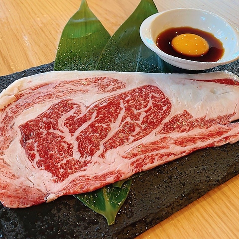 厳選した国産黒毛和牛リブロースを焼台からはみ出すくらいのサイズでスライス!サッと炙り焼き、鬼おろし+ゆずポン酢で召し上がれ~