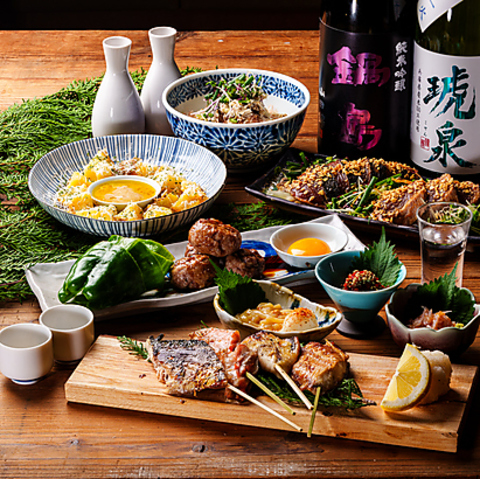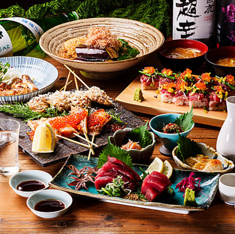 豊洲市場で仕入れた新鮮な本マグロの刺盛りを始め、炭火焼き大トロサーモンとイクラの親子焼き串や本日の特製漬け魚串山わさび添えなど…"炙処 火ノ膳"の人気メニューが全8品楽しめる贅沢なコース。2時間飲み放題付きで各種ご宴会にオススメです!