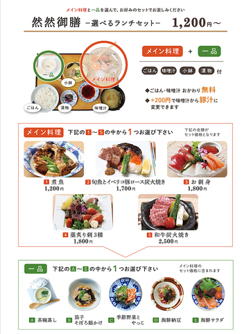メインのお料理と一品料理を選べる然然ランチセットはご飯のおかわりも無料で1200円から。