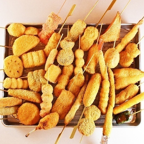 串カツ食べ放題&飲み放題コース◎ 毎日お店で手仕込みしている自家製の串カツを心ゆくまでお楽しみください♪.お肉にお野菜と日替わりで30種類以上ご用意しております。極細かい衣で高温でカラッと揚げているのでサクサクいくらでも食べられちゃいます!