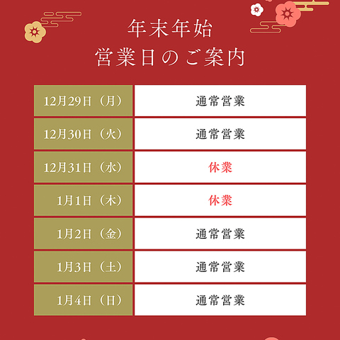 テイクアウトも営業時間内で実施しております 【年末年始 営業日のご案内】12月29日(月)、12月30日(火)…通常営業/12月31日(水)、1月1日(木)…休業/1月2日(金)、1月3日(土)、1月4日(日)…通常営業
