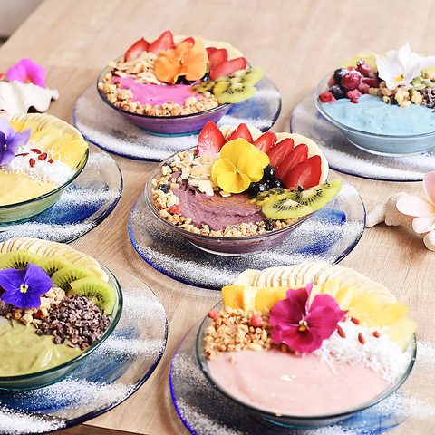 【こだわり1】アサイーボウルなど、6色(着色料不使用)のフルーツボウル 【こだわり2】トロピカルフルーツとスーパーフードであふれる 【こだわり3】ヘルシー&ローカロリーながらもしっかりとした食べごたえ 【こだわり4】 かき氷専門点のノウハウが生み出す、濃厚な味わい