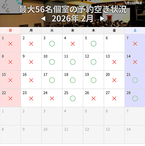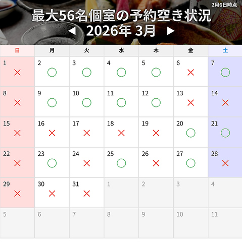 | 個室 | あり :完全予約制(10名×2/16名/56名) |