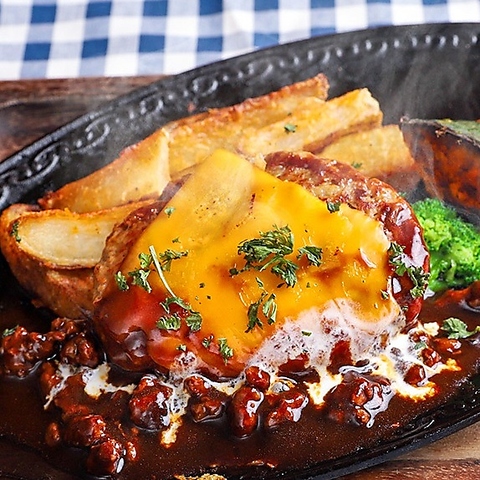 肉×チーズの贅沢感☆とろ~り濃厚チーズの贅沢ハンバーグ♪熱々の鉄板の上でジュワッと音を立てるジューシーなハンバーグを、お肉たっぷりデミグラスソースと濃厚チーズソースで仕上げます☆お肉とチーズが絡まり合う瞬間は、まさに至福☆肉の旨味とチーズのコクを存分に堪能して下さい。サラダ、パンorライス、ドリンク付