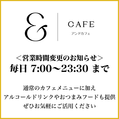 月~日、祝日、祝前日: 07:00~23:30 (料理L.O. 23:00 ドリンクL.O. 23:00) 全日(7:00~23:30)アルコールドリンクやおつまみフードのご提供もしております。日中のちょい飲みや飲み会終わりの2次会や3次会にもぜひお気軽にご利用くださいませ。 |