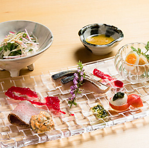 旬の前菜 3種/旬の有機野菜スティック(自家製ディップ)/酒肴/旬と創作串揚げ 10種/お箸休め(焼き物)/季節のデザート ※詳細はコースページにてご確認ください。