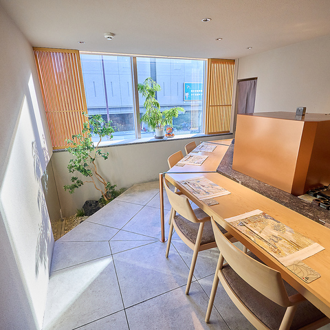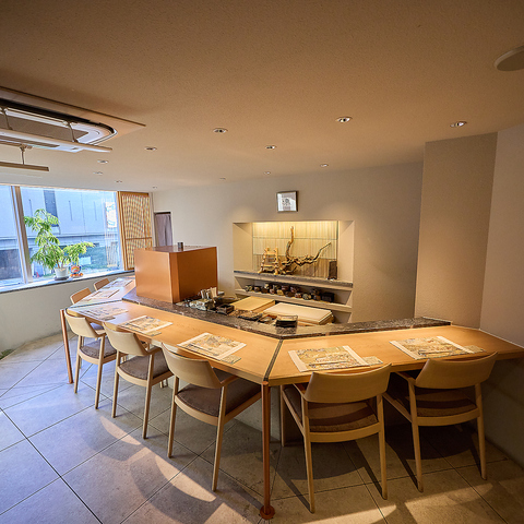 ≪極上の逸品を五感で愉しむ特等席。≫カウンター席は、ライブ感溢れる7席をご用意。お席の間隔が広く、周りを気にせずリラックスできるため、デートや記念日、誕生日などのハレの日にもぴったり。目の前で繰り広げられる調理風景を五感で愉しむ特別な空間。大切な人と一緒に、心温まるひとときをお過ごしください。