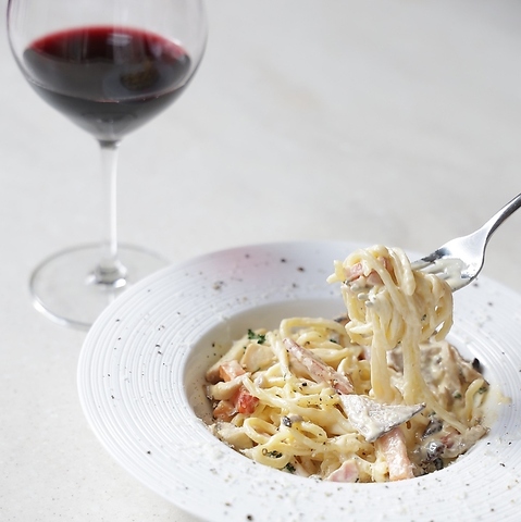 本場イタリアで修業した有名シェフが監修の絶品パスタ!もちもち生麺を使用したこだわりの逸品。トマト、クリーム、オイルなど、毎週テイストが変わります♪(ランチ限定、セットドリンクあり、大盛り+150円)