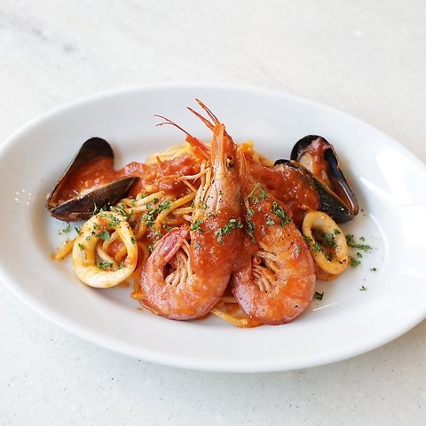 海老やイカ、ムール貝を旨みたっぷりのトマトソースで仕上げた絶品パスタ。