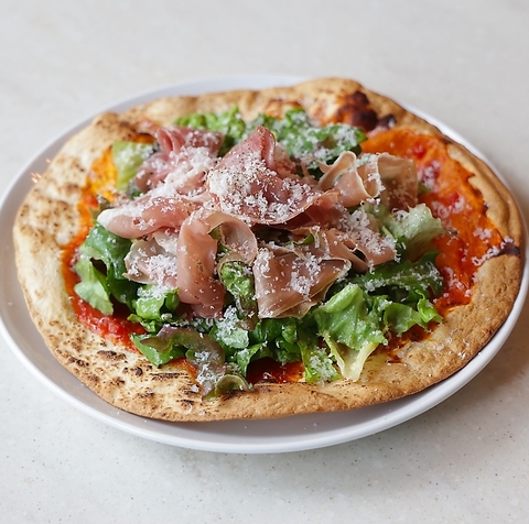 生ハムとルッコラをたっぷりのせたサラダ感覚のピザ。
