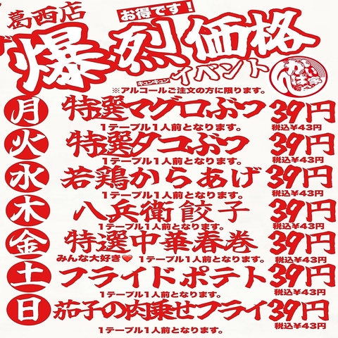 【葛西限定】情熱価格!曜日別で情熱価格イベント開催中!赤字必死の注文率ほぼ100%の自信のメニューです♪