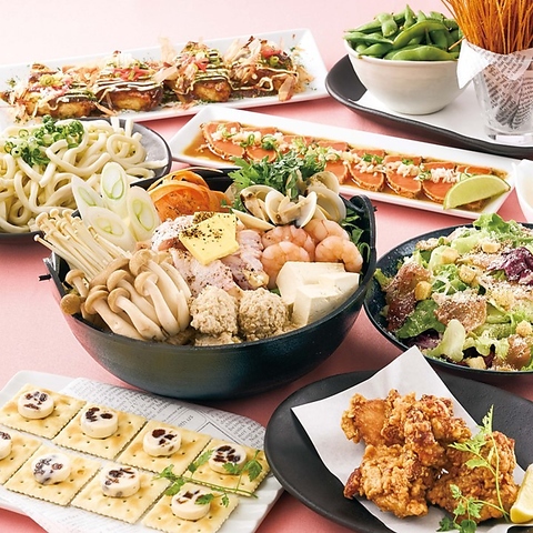 土間土間自慢の料理を堪能!あつあつお好み焼き、鶏肉とつみれのちゃんこ鍋など、全8品のラインナップ☆飲み放題は生ビールもOK!各種宴会に是非ご利用下さい!