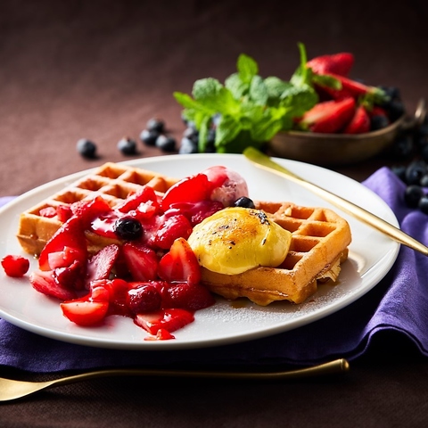 店舗で焼き上げる、バターミルクアメリカンワッフル。芳醇な発酵バターの香りと卵の風味が、口いっぱいに広がる、軽やかで優しい味わいのワッフルです。