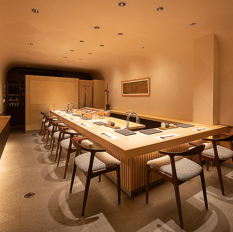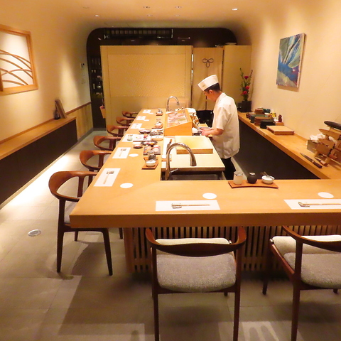 【和の趣を感じる上質空間】お一人様でも気兼ねなくくつろげる国産檜を使用したカウンターです。丁寧に繊細な手業で料理をする職人を目の前でご堪能くださいませ。