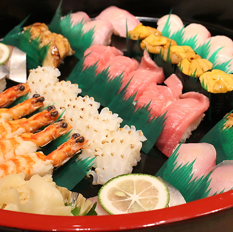 中トロ・イカ・ウニ・カンパチ・車海老・穴子・白身・タコ・鉄火巻・カッパ巻*仕入れ・季節の状況により内容が変更になる場合がございます。*1人前からでもご注文可能です。