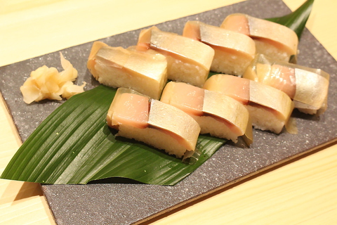 脂がのった鯖をこってり甘く煮込んだ松前昆布で巻いた当店人気の押寿司です。