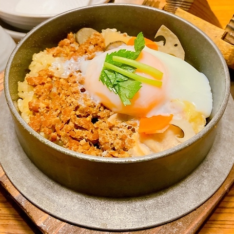 とり五目とつくねそぼろと温泉卵の二色釜めし/つくねそぼろと温泉卵の釜めし