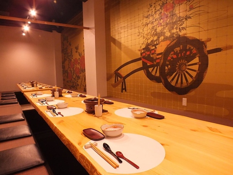 大人数でのご宴会に最適な堀ごたつ式の個室は、最大28名様まで対応可能です◎足元ゆったりの掘りごたつで、快適にくつろぎながらお食事を楽しめます。歓送迎会や会社宴会など各種宴会に大変お薦め♪人数や用途についてはお気軽にご相談ください。趣の異なる全20室の個室から、最適なお席をご用意いたします。