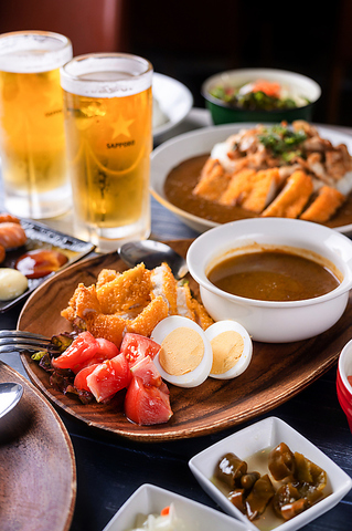 店内は広々としており、どこか懐かしくあたたかい雰囲気。本格手作りカレーだけでなく、多彩なドリンク・おつまみ・飲み放題付コースもございますので、飲み会・貸切パーティーにもぜひご利用ください♪