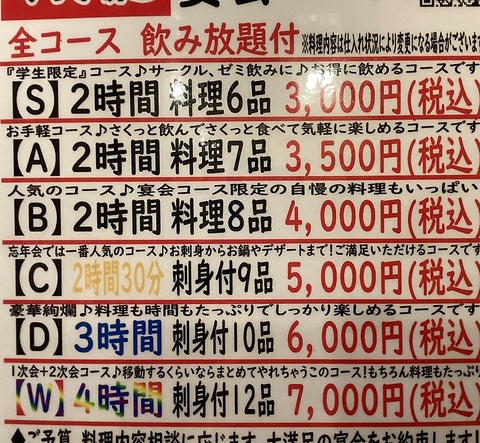 | 料金備考 | お通し有り(お通し代374円)/お食事付きコース以外税別価格 |