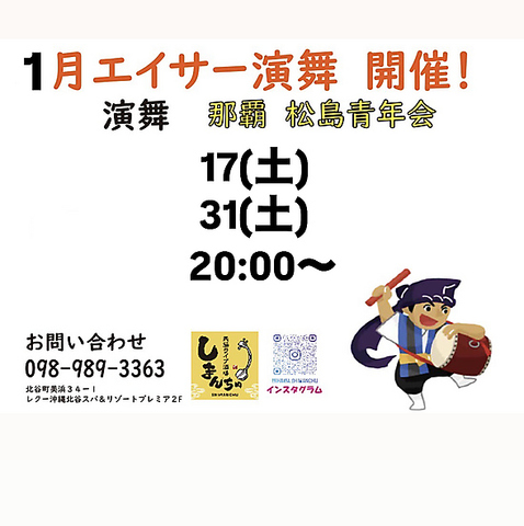 一緒に盛り上がれる三線ライブをお楽しみください。毎日開催!4/1より、18:30~・19:30~・20:30~です!