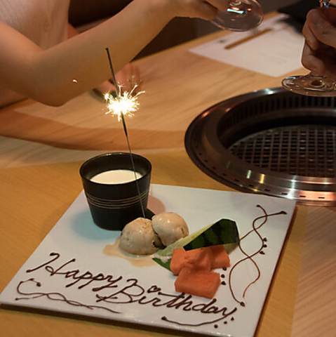 特別な日のご利用にピッタリなサプライズプレートをご用意しております。さらにプレート内には「Happy Birthday○○ちゃん」「お疲れ様でした○○さん」等、20文字程度のメッセ―ジを入れる事も可能です。花火をつけてお食事の終わりにそっとお持ち致します。※詳細につきましては、料理ページ・クーポンページをご確認下さい。