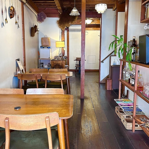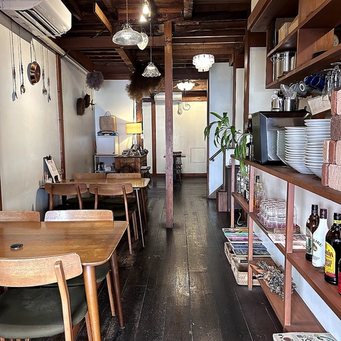 木製のテーブルと椅子が並び、温かみのある照明が心地よい店内です。アンティーク調の小物や壁の装飾がアクセントとなり、落ち着いた雰囲気の中でゆっくりとお食事やカフェタイムをお楽しみいただけます。お一人様でも気軽にお立ち寄りいただけます。
