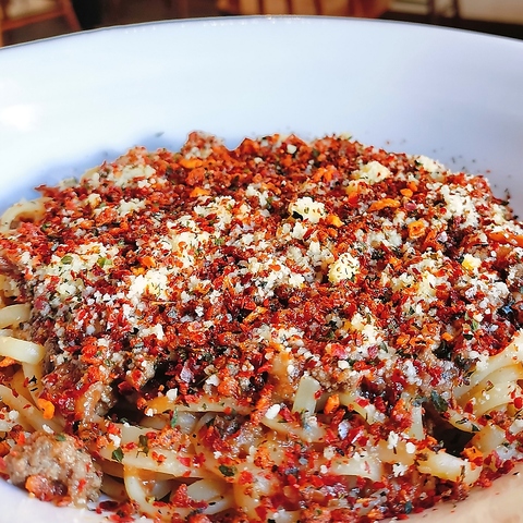 粗挽き牛肉と香味野菜を強火で炒め、スパイスとブランデーで香り豊かに仕上げた「城下ミートソース」は、まさに大人のための逸品☆牛肉の旨味とトマトの酸味、香味野菜の奥深さが溶け合い、ピリッとした唐辛子がアクセント。いつものパスタを贅沢な一皿に変える、至福のミートソースをぜひご賞味ください◎