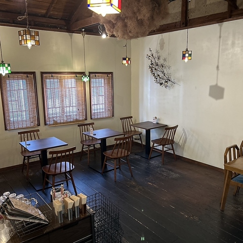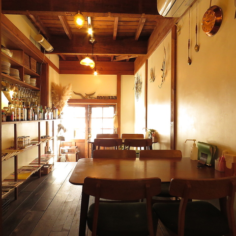 温かみのある木目を基調とした店内は、奥へと続く開放的な空間が広がります。アンティークな装飾品や可愛らしい小物に囲まれ、ゆったりと落ち着いた雰囲気でお食事やカフェタイムをお過ごしいただけます。
