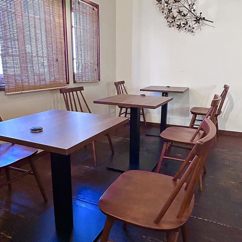 温かみのある2名がけの木製テーブルが9卓ございます。カジュアルなランチからカフェ利用、親しい方とのゆったりとした会話まで、様々なシーンに合わせてご利用いただけます。窓から光が差し込む明るい空間で、おくつろぎください。