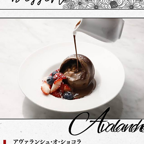 シェフ自慢のチョコレートアートを細こしたお皿。大切な方のお祝いは、JINの特別なデザートプレートで。