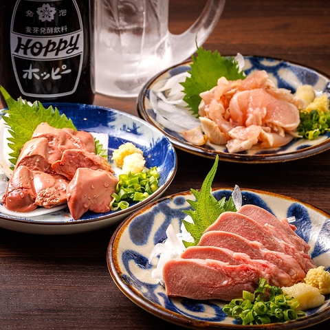 五右衛門の名物は大釜もつ煮と焼き師が約焼きとんですが、肉刺しも大好評販売中!!一押しは3種盛り♪単品の肉刺しメニューもご用意しております!