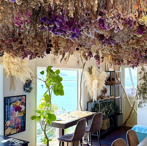 【ドライフラワーに囲まれた店内でゆったりと】当店は糸島の海を一望できるうえ、天井いっぱいに広がったドライフラワーを眺めながらお食事をお楽しみいただけます。さらに当店はディナータイムもご予約頂ければご案内も可能です。デートなど特別な日のお食事にも是非ご利用下さい。