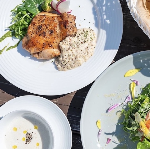 当店はランチ、ディナーともに糸島の野菜や食材を心ゆくまでお楽しみいただけるようコースでご用意しております。前菜からメイン、デザートに至るまで旬の食材を使用し、四季折々のお料理をお楽しみ頂けます。目で見ても、食べてもお楽しみ頂ける。彩り豊かな料理を景色と共にお楽しみ下さい。