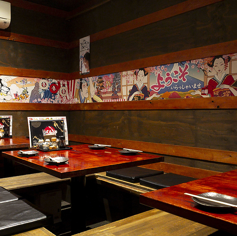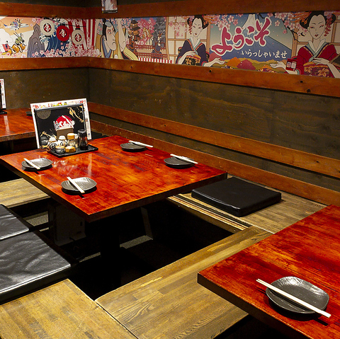 人気の掘りごたつ席、ご用意ございます!お席は、お祭りのような明るい雰囲気の絵が!デートから少人数の飲み会、更には大人数での宴会まで大小様々なお席で素敵なひとときをお過ごしください♪席の種類も「掘りごたつ」「テラス席」「テーブル」「カウンター」と豊富です!お気に入りの席でゆったりとおいしいお料理をご堪能あれ!