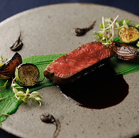 厳選したお料理に合うワインペアリングがついたコース。A5黒毛和牛メス肉のみを使用しており、柔らかく肉質の良い部位のみを使用