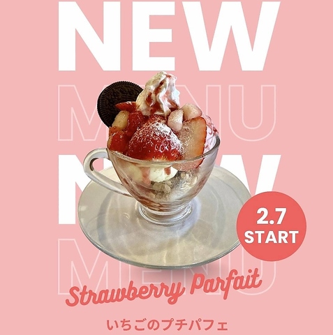 みずみずしいいちごをたっぷり使い、クリームやクッキーを添えた見た目も華やかなプチパフェ。ほどよい甘さと爽やかな酸味が楽しめる、ティータイムにぴったりの期間限定スイーツです。