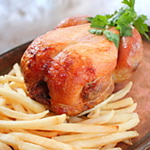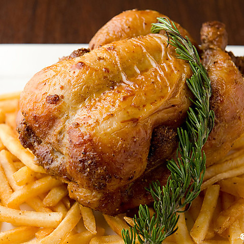 じっくり火入れしたローストチキンは皮は香ばしく身はふっくらジューシー!ワインとの相性も良い◎