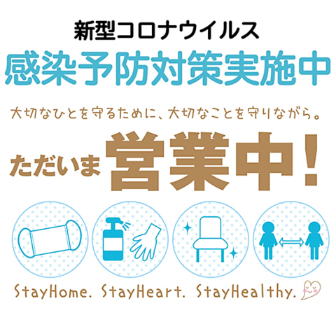 新型コロナウイルスの感染予防のため、「アルコール消毒の徹底」・「店内の換気」・「マスクの着用」・「席の間隔確保」を徹底しております。
