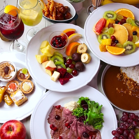 フルーツ屋さんだからできる新鮮なフルーツ&手作りスイーツに加え、カレーやパスタ、サラダにスープまで食べ放題!!