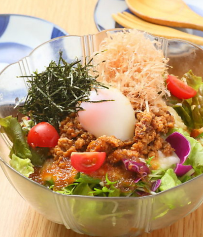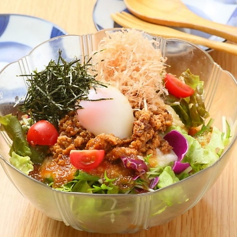 とろろと鶏そぼろ、温玉が乗った、名物きよみずサラダ~自家製和風ドレ~ 970円(税込)