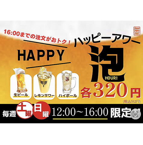 土日は12時から16時限定!昼飲みにぜひ!生ビール、ハイボール、レモンサワーがで290円☆