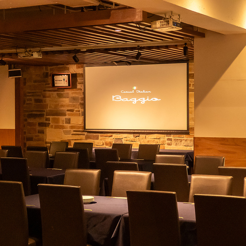 全てのお席から見える120インチスクリーン3台とプロジェクター3台&60インチ液晶モニター完備!お手製のDVD再生はもちろん、パソコン接続も可能です。パワーポイントを使用したパーティー進行、知人からの動画メッセージなど、ワンランク上のパーティー演出に最適です。