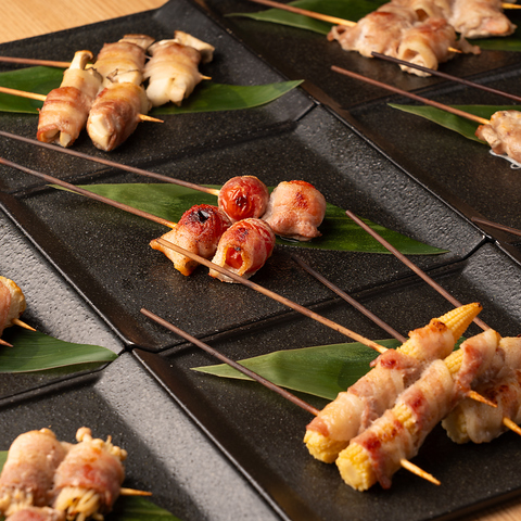 巻き串の種類が豊富!大根巻き串2本/えのき巻き串2本/エリンギ巻き串2本/ミニトマト巻き串2本/うずら巻き串2本/竹輪巻き串2本/梅紫蘇巻き串2本//モッツアレラ巻き串2本/紫蘇にんにく巻き串2本/万能ねぎ巻き串2本/ヤングコーン巻き串2本/海老巻き串2本/お任せ巻き串6種/お任せ巻き串9種