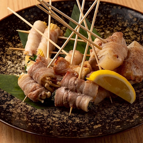 巻き串の種類が豊富!大根巻き串2本/えのき巻き串2本/エリンギ巻き串2本/ミニトマト巻き串2本/うずら巻き串2本/竹輪巻き串2本/梅紫蘇巻き串2本//モッツアレラ巻き串2本/紫蘇にんにく巻き串2本/万能ねぎ巻き串2本/ヤングコーン巻き串2本/海老巻き串2本/お任せ巻き串6種/お任せ巻き串9種
