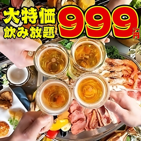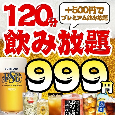 2時間飲み放題を999円にて開催中!大丈夫のレモンサワーやビール、焼酎、日本酒など多数ございます!