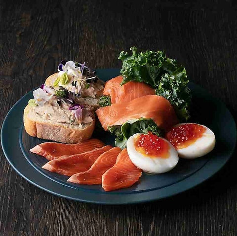 サーモンカルパッチョ / スモークサーモンとケールのサラダサーモンパテのカナッペ / 半熟卵のいくらのせ