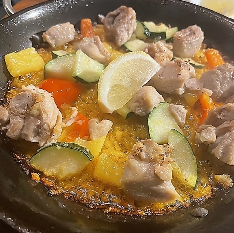 鶏肉と野菜の旨味を米に閉じ込めたスペイン風炊き込みご飯。サフランの香りとレモンの爽やかさが絶妙です!